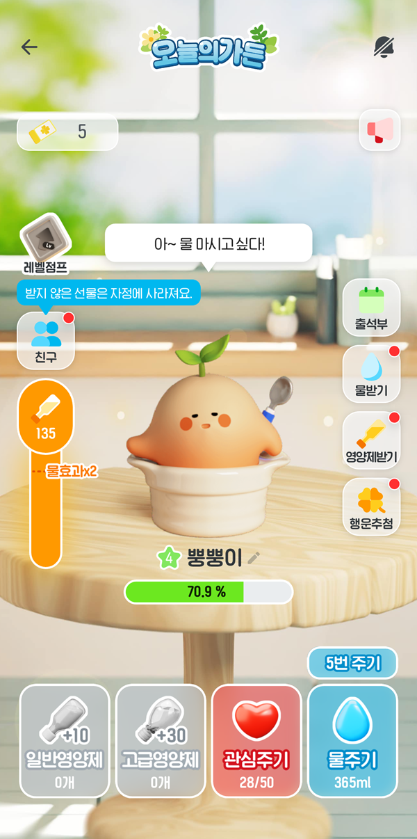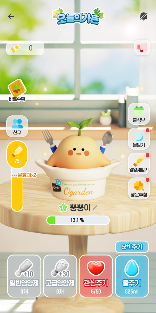 올팜을 해보신 분이라면 굉장히 익숙하실 수 있는데, 인터페이스가 아주 비슷해요. 미션을 통해 영양제를 모으고, 물을 모아서 키우는 방식이 거의 동일합니다. 대신 올팜에 비해서 미션 수가 적은 편이라서 좀 더 간단해요. 역시나 영양제를 먼저 줘서 물효과 2배일 때만 물을 줘야 효과적으로 성장시킬 수 있습니다. 역시나 친구를 맺어야 물과 영양제를 주고받을 수 있어요.