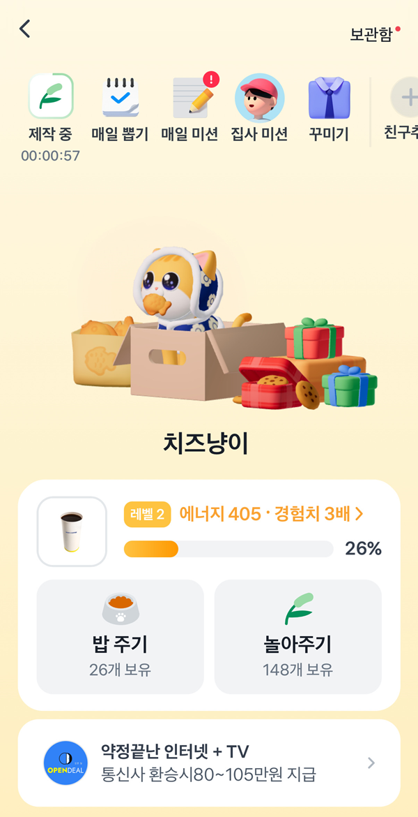 치즈냥이를 키우고 있는데요. 올팜과 오늘의 가든과 조금 다른 듯하지만, 역시 비슷한 면이 있어요. 밥주기와 놀아주기가 있는데, 밥주기를 먼저 해서 에너지를 채워서 경험치 3배일 때 놀아줘야 효과적으로 성장시킬 수 있어요. 미션이 많지는 않아서 그냥 시간날 때 들어가서 잠깐씩 해주면 돼요.