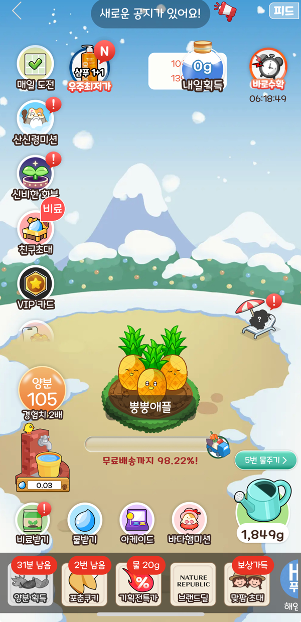 올팜을 해보신 분이라면 굉장히 익숙하실 수 있는데, 인터페이스가 아주 비슷해요. 미션을 통해 영양제를 모으고, 물을 모아서 키우는 방식이 거의 동일합니다. 대신 올팜에 비해서 미션 수가 적은 편이라서 좀 더 간단해요. 역시나 영양제를 먼저 줘서 물효과 2배일 때만 물을 줘야 효과적으로 성장시킬 수 있습니다. 역시나 친구를 맺어야 물과 영양제를 주고받을 수 있어요.