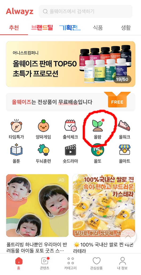 올웨이즈에서 홈 화면 중앙에 있는 올팜으로 들어가시면 됩니다.