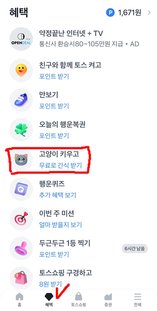 혜택에 보시면 고양이 키우고 무료로 간식 받기라고 있습니다.