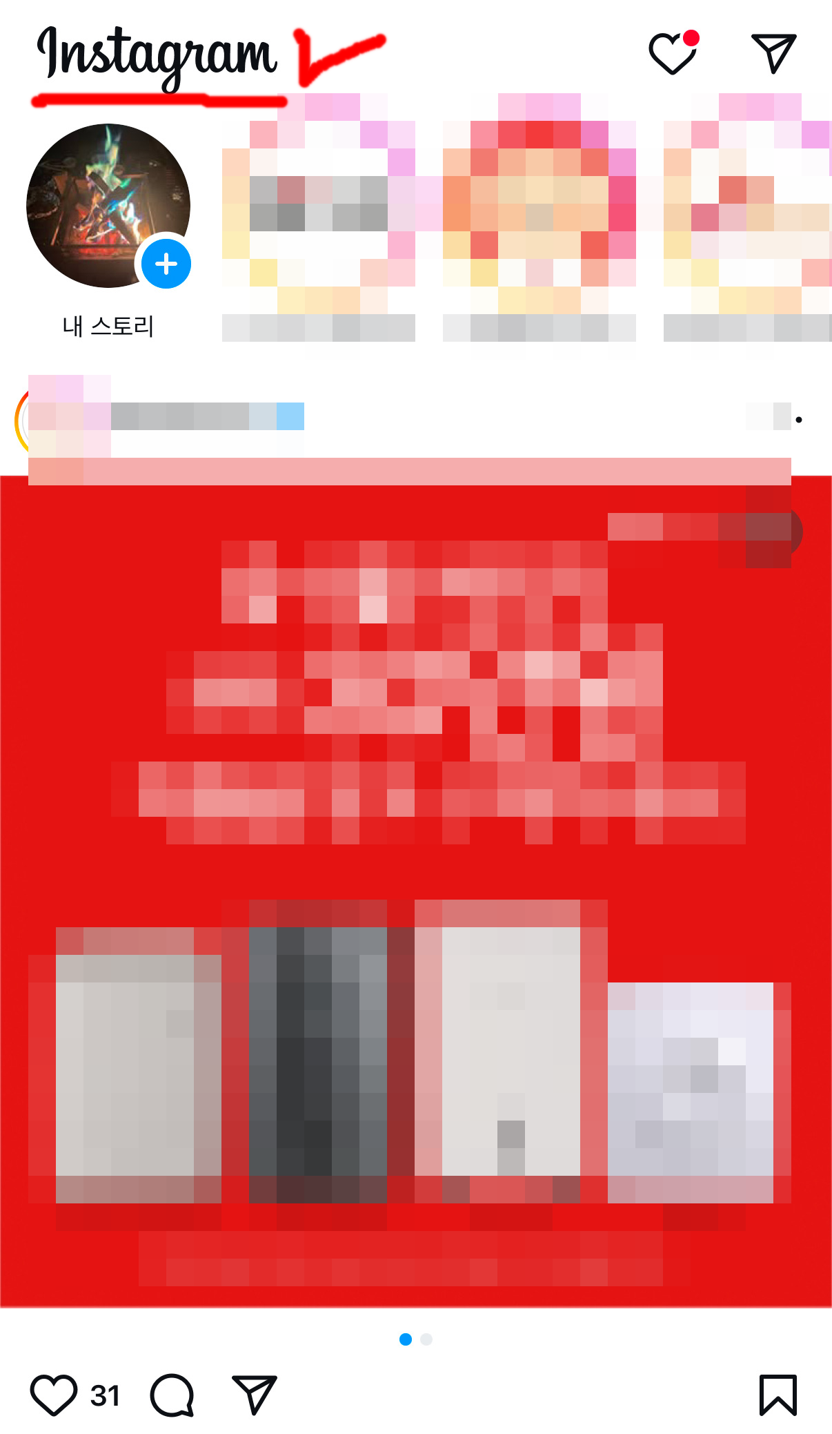 인스타 홈화면에서 맨 위 왼쪽에 Instagram이라고 써 있는 부분을 클릭해주세요.